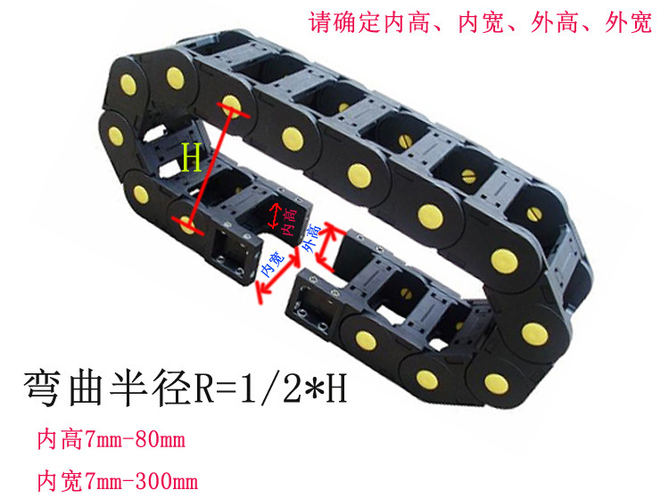 (3)單元鏈節(jié)由左右鏈板和上下蓋板組成,拖鏈每節(jié)都能打開,裝拆方便,不必穿線,打開蓋板后即可把電纜、油管、氣管、水管等放入拖鏈。